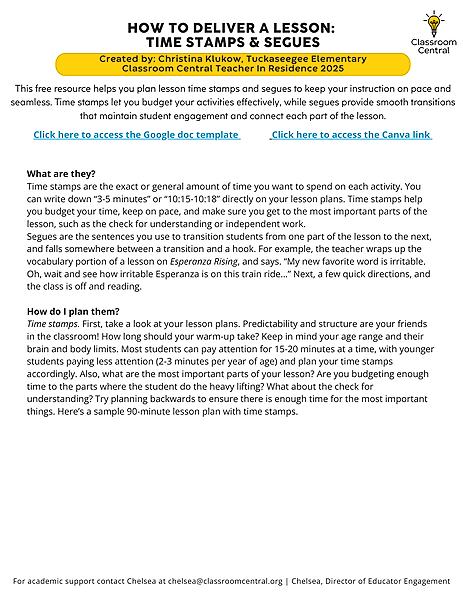 This free resource helps you plan lesson time stamps and segues to keep your instruction on pace and seamless. Time stamps let you budget your activities effectively, while segues provide smooth transitions that maintain student engagement and connect each part of the lesson.