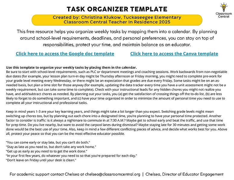 This free resource helps you organize weekly tasks by mapping them into a calendar. By planning around school-level requirements, deadlines, and personal preferences, you can stay on top of responsibilities, protect your time, and maintain balance as an educator.